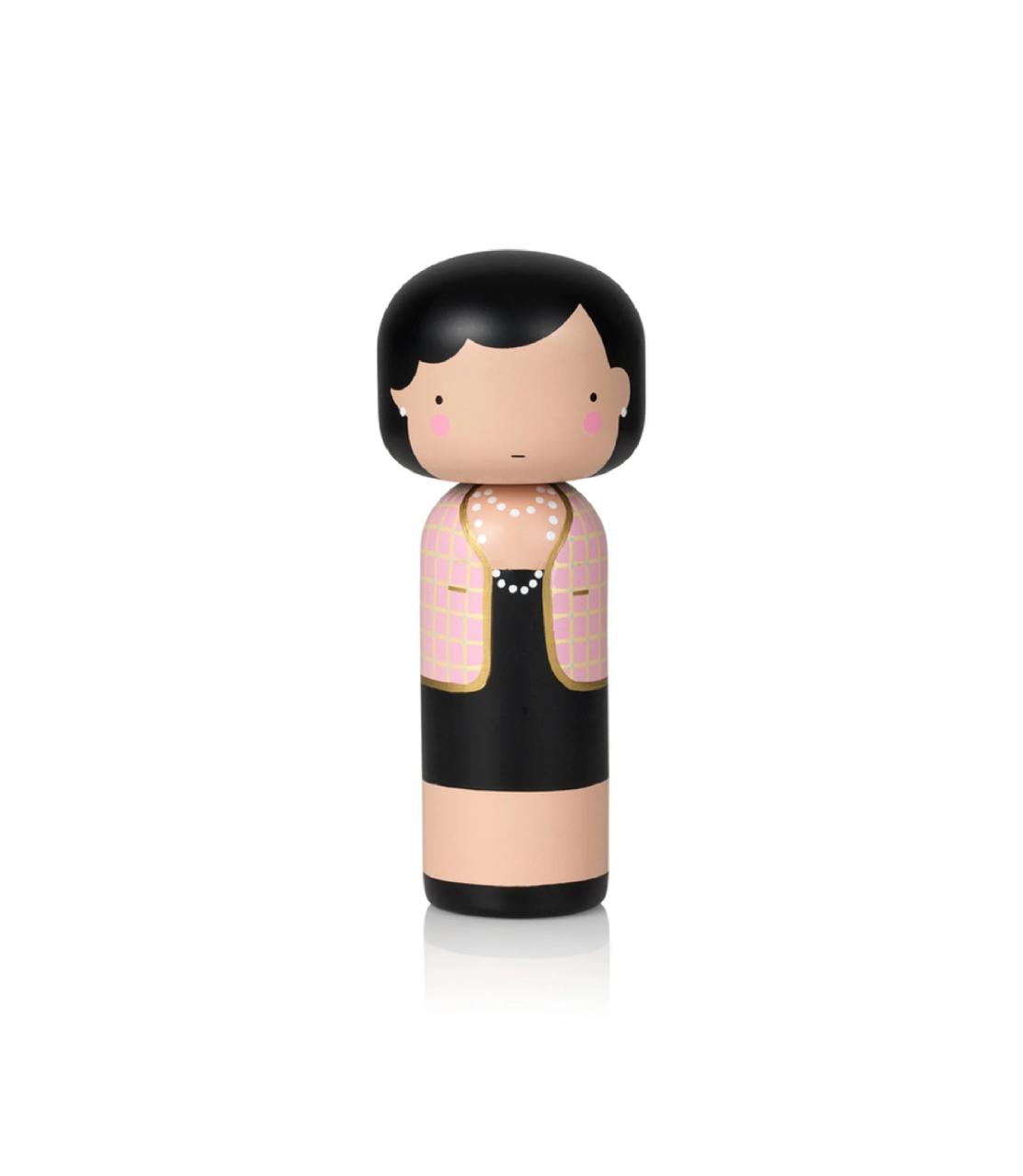 Coco con un atuendo rosa es una impresionante kokeshi que rinde homenaje a la icónica diseñadora de moda de una manera divertida y extravagante.