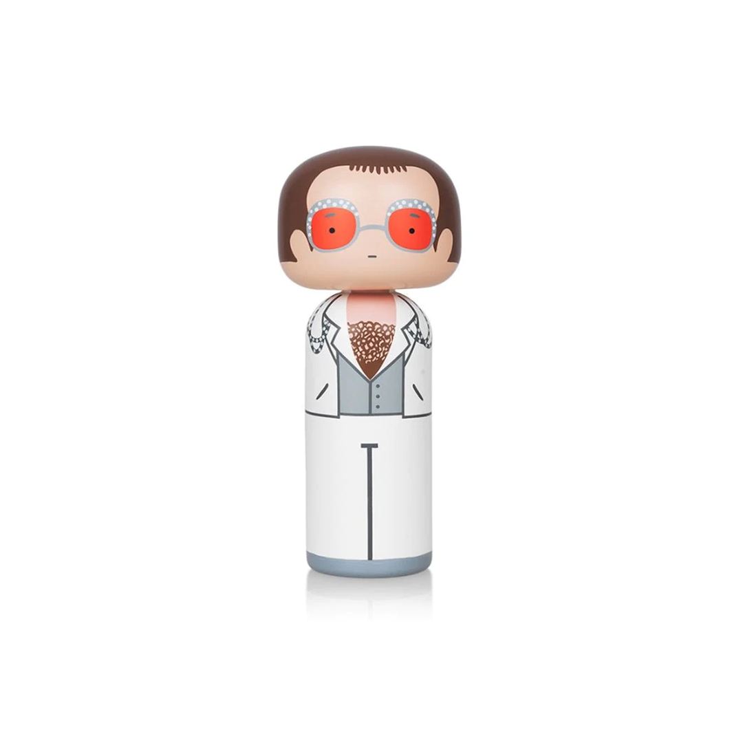 Este Kokeshi Doll, no solo representa a uno de los artista pop más vendidos del mundo, sino que también hace referencia a sus famosos y extravagantes trajes. Este icónico traje blanco cubierto de plumas, lo llevaba en una sesión de fotos de relaciones públicas en su casa en 1974.